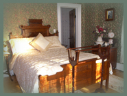 This grand room is furnished in the dapper style to which Mr. Stone was accustomed. With its green carnation scroll wallpaper, to the hand-carved headboard, and well-appointed furnishings, visitors are sure to enjoy this elegant bedroom. The high ceilings, chandelier, and stained glass window facing east add much to your restful experience. Jesse's room features a queen size bed and shares the second floor parlor with Sarah's room. The bathroom features a shower, floral wallpaper and stained glass window. The room is air conditioned in summer.